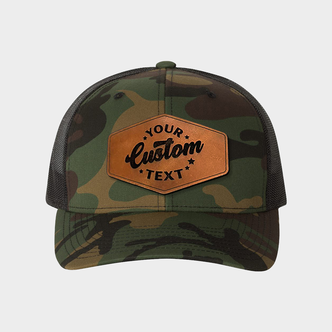 Your personalized leather patch hat—customized with your logo, image, or text and engraved on premium leather. Choose from a variety of camo styles to match your brand, team, or outdoor lifestyle.